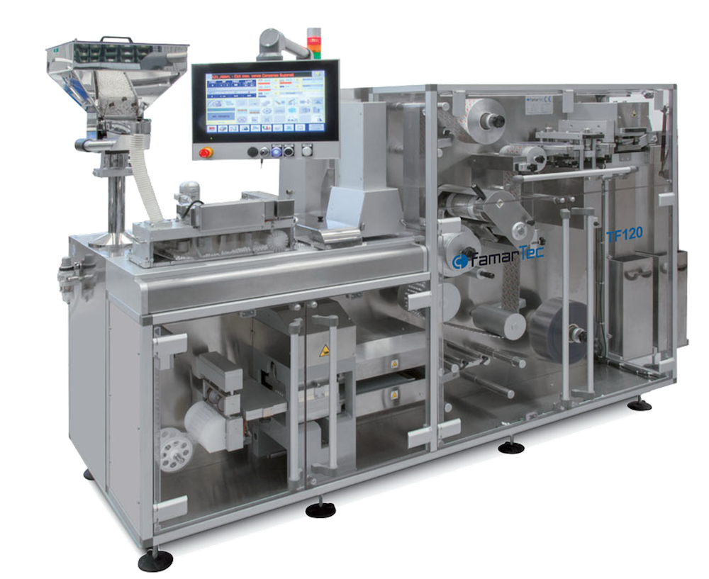 La TF120 è una blisteratrice compatta e ad alta efficienza, progettata per piccole chiusure e spazi ristretti, con una produzione fino a 180 blister/min, a seconda del formato e dei materiali.